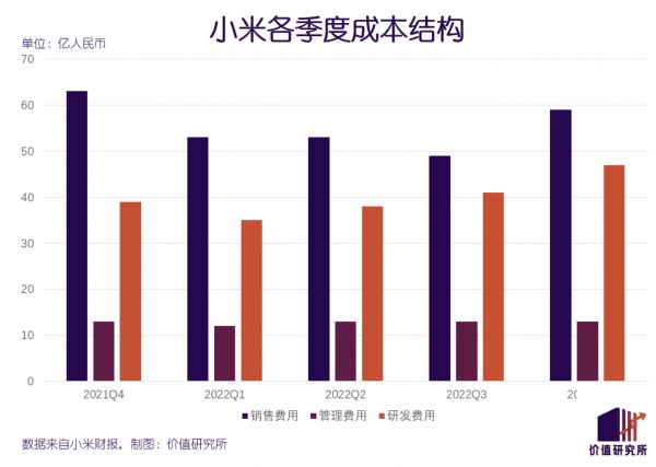 数据显示,四季度小米销售费用为59亿元,同比上涨8.9%,略高于市场预期的7.7%。管理和研发费用则分别为12亿元和47亿元,同比分别增长2%和7.1%。需要注意的是,考虑到智能电动车等创新业务仍在攻坚阶段且团队规模不断扩大,小米研发、管理成本可能会进一步上涨。