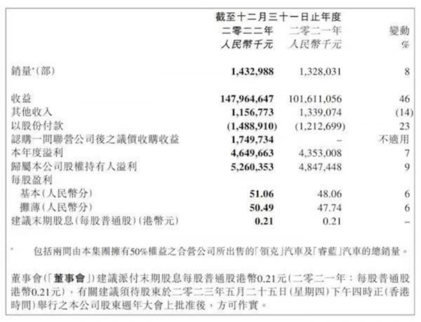在销量方面,公司累计销售量为143.3万辆,同比增长8%。其中,睿蓝总销量5.6万辆;极氪总销量7.2万辆,同比增长1097.2%;领克总销量18万辆,同比下降18.3%。此外,2022年吉利汽车平均单车销售收入10.3万元,同比增长29.6%;总收益提升至1480亿元,同比增加45.6%。
