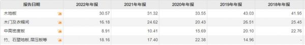 事实上,主营业务毛利率持续下跌的情况也较为严峻。2022年中高密度板与木地板毛利率分别同比下滑1.5%、0.75%。其中,中高密度板毛利率从2019年的20.1%跌至2022年的8.91%,木地板毛利率从2019年的43.03%跌至如今的30.57%,均已连续四年下滑。