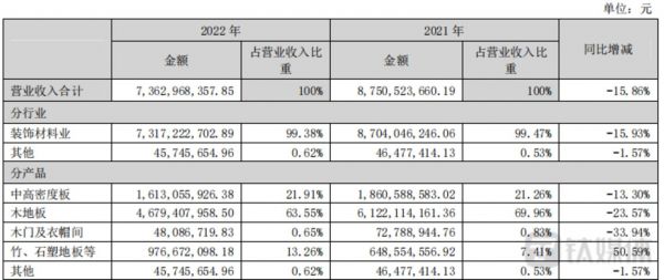中高密度板和木地板两大业务是大亚圣象的主要收入来源。2022年中高密度板实现收入16.13亿元,占总营收的比重为21.91%;木地板实现营收46.79亿元,占总营收的比重为63.55%。但上述两项业务营收在2022年分别同比下滑13.3%、23.57%。
