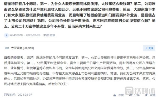 年报显示,第一大股东大亚集团质押股份数为1.96亿股,占其全部持股数的77.1%。目前,大亚圣象35.81%股份处于质押状态,均来自于大亚集团。高比例质押也引起投资者在互动易平台上质疑,为什么大股东长期高比例质押,大股东这么缺钱吗?董秘回应称,公司大股东质押主要用于其自身生产经营,且质押风险可控。钛媒体APP就此多次致电大亚圣象进一步了解情况,但截至发稿电话未有人接听。
