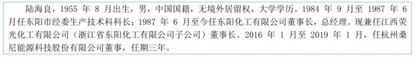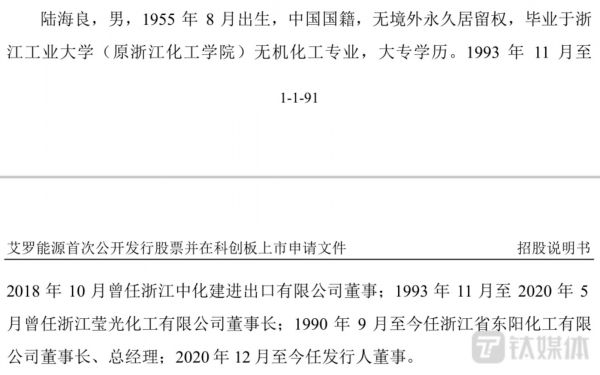夫妻俩的亲家陆海良的简历也存在着前后不符的情况,其在桑尼能源的年报中1987年就已经在东阳化工有限公司任职,但在艾罗能源的招股说明书中不仅在东阳化工的任职时间发生了改变,其在桑尼能源任职的信息也一并被抹去。