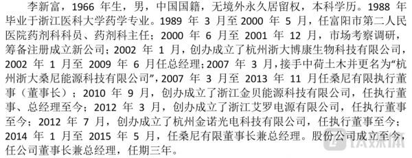 不仅如此,李新富在富阳市第二人民医院的从业时间也颇有蹊跷。在桑尼能源的简历中,1988年李新毕业,1989年才开始在上述医院工作,但在艾罗能源的简历中这段经历被提前到了1984年,大学4年的经历被硬生生抹掉。