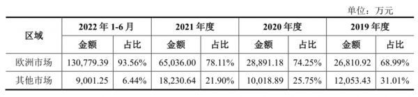 艾罗能源披露的数据显示,其产品主要销往包括欧洲、美国、澳大利亚等境外国家和地区。其中,欧洲为公司的最大销售市场,报告期内公司在欧洲的销售收入占营业收入的比例分别为 68.99%、74.25%、78.11%和 93.56%,超过9成的营收占比显然已经形成了高度依赖。