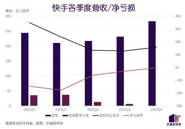四季度,快手总营收为282.92亿元,同比增长15.8%,增速低于2021年同期的35%,但优于市场预期的11.6%;全年总营收则为942亿元,同比增长16%,也超过市场预期的931亿元。如果和去年前三个季度相比,Q4营收增速不功不过,保持平稳。