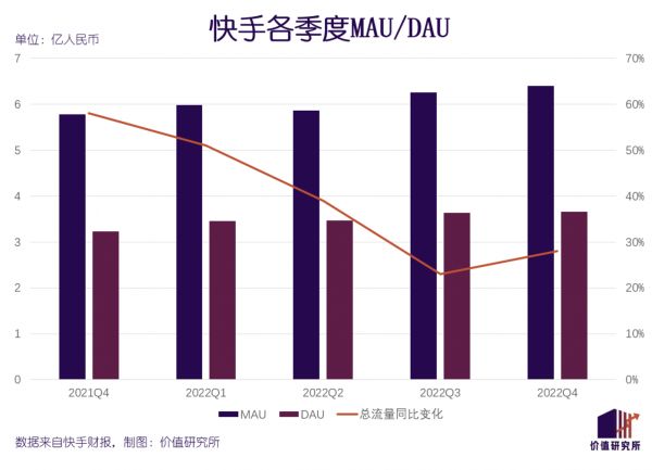 然而,经过数年高速增长,短视频用户规模即将见顶,快手、抖音等平台的用户增量难免会逐步下滑。Questmobile的统计显示,去年四季度快手日均总流量同比增速为28%,远低于2021年同期的58%。