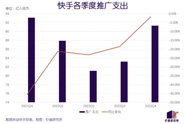 尤其是销售及营销费用,全年同比锐减16%,直接砍掉了超70亿元开支,费用率也从2021年同期的54.5%下降至如今的39.4%。从增长曲线看,快手的推广及广告开支已经连续四个季度减少,同比降幅分别为21.22%、23.15%、18.5%和1.84%。