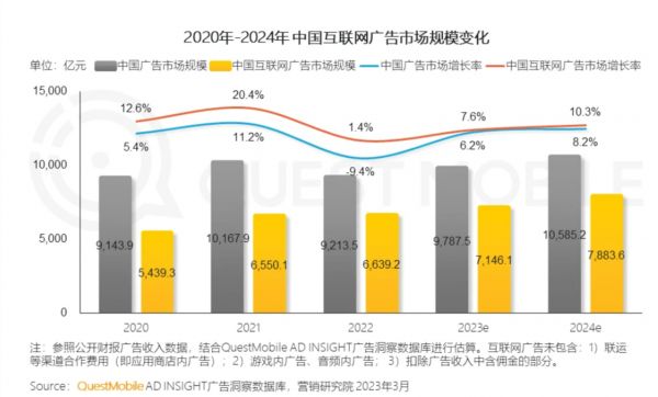 同样来自Questmobile的报告指出,2022年互联网广告市场规模为6600亿元,同比增幅仅为1.4%。细分数据则显示,电商、短视频是广告规模最大的两个行业,可惜增速也在下滑。