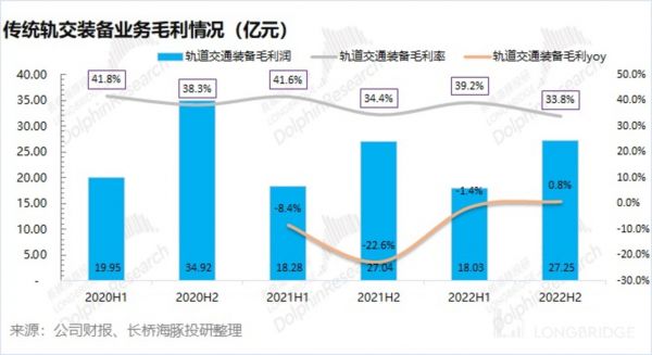 2022 年下半年公司传统轨交设备业务实现毛利 27.25 亿元,同比增长 0.8%。传统轨交业务的毛利率下滑至 33.8%,其实能看出毛利率在上下半年是有不同。主要是下半年轨道交通电气设备收入较大,而该业务的毛利率偏低,导致下半年的毛利率往往是偏低的。