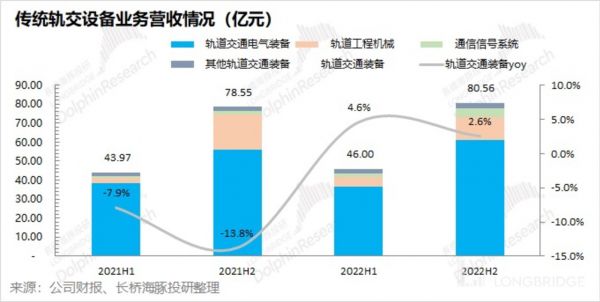 单看下半年,传统轨交业务实现收入 80.56 亿元,同比增长 2.6%。细分来看,①轨道交通电气设备在下半年实现收入 61.33 亿元,同比增长 9.1%。这是轨交业务中最大的一项,下半年重回增长,主要是年底前加快了轨交的交付;②轨道工程机械在下半年实现营收 11.68 亿元,同比下滑 37%;③通信信号系统在下半年实现营收 4.71 亿元,同比增长 229%。