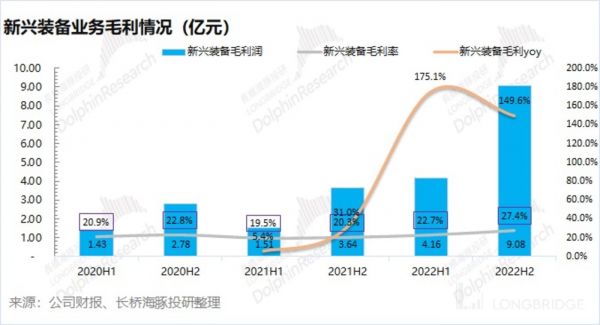 2022 年下半年公司新兴装备业务实现毛利 9.08 亿元,同比增长 149.6%。新兴装备业务毛利的增速超过收入增长,其中公司下半年新兴装备业务毛利率为 27.4%,同比上升 3.2pct,创历史新高。