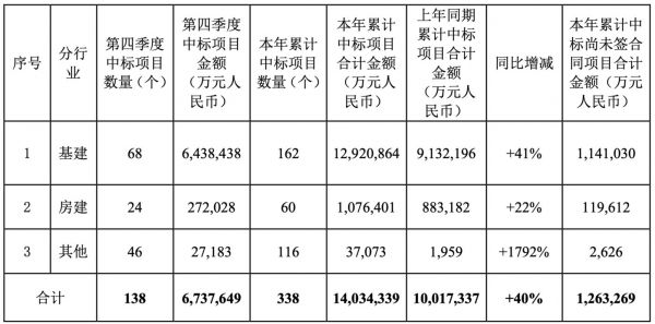 根据公司披露的经营数据,2022年,公司累计中标项目338个,中标合同金额约为1403亿元,同比增长40%。其中基建、房建各中标162个、60个,中标额1292.09亿元、107.64亿元。其中,仅第四季度就中标138个项目,中标额673.76万元。