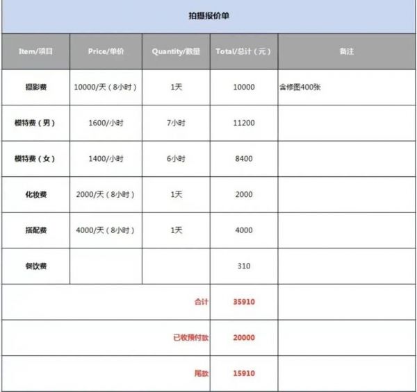 按照价目表,一天8小时拍摄,需要支出3.6万元。其中摄影费(包含400张修图)1万,男模和女模费用超2万,化妆费2000元,搭配费4000元。
