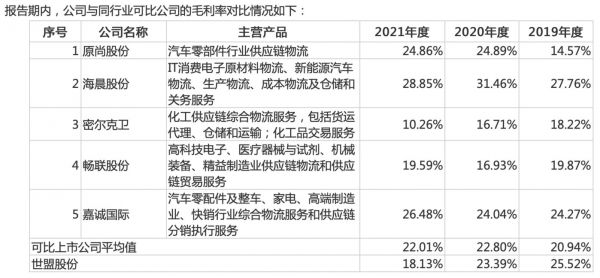 在此影响下,2019年至2022年,世盟股份的综合毛利率分别为25.52%、23.39%、18.13%、19.95%,2021年已低于同行可比公司均值。