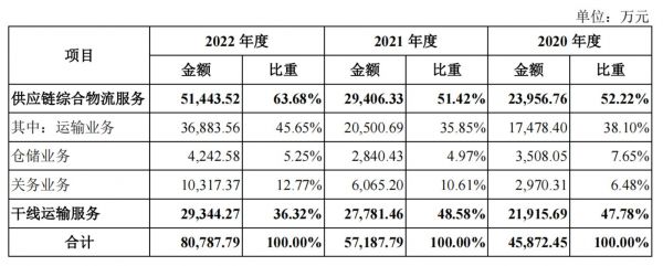 从具体业务来看,公司主要收入来源包括提供运输服务、仓储服务、关务服务在内的应链综合物流服务和干线运输服务。其中,运输业务收入占比最高,已超过45%。