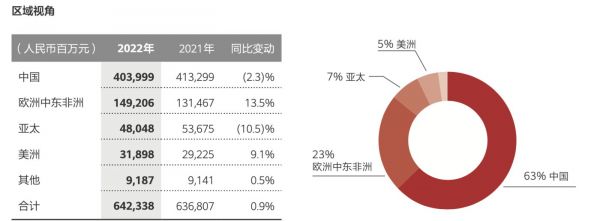 按区域划分来看,中国市场实现销售收入人民币4040亿元,同比下降2.3%,占总体收入63%;欧洲中东非洲地区实现销售收入1492亿元,同比增长13.5%,占总体收入23%;亚太地区实现销售收入48亿元,同比下降10.5%,占总体收入7%;美洲地区实现销售收入319亿元,同比增长9.1%,占总体收入5%。