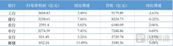值得注意的是,工商银行和建设银行的营收出现了负增长,尤其工商银行的营收较上年明显下滑了2.63%。邮储银行则营收增长5.08%,增幅为六大行中第一。