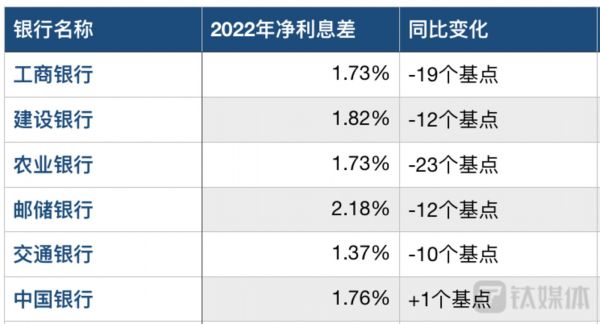 除中行外,其余5家银行净息差均出现下滑。其中,工行2022年净利息差为1.73%,比上年下降19个基点;建行净利差为1.82%,同比下降12个基点;农行净利差为1.73%,下降23个基点;邮储银行净利差为2.18%,下降12个基点;交行净利差为1.37%,下降10个基点。