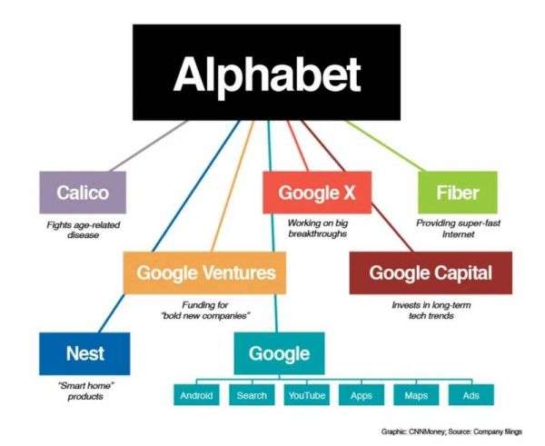 2015年,Google巨变,成立Alphabet控股公司,原来的Google变成子公司,各类创新业务也变成子公司,统一由Alphabet控股。