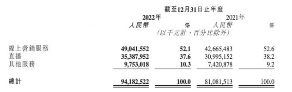 从营收结构来看,线上营销服务、直播和其他服务(含电商)对快手年收入的贡献占比分别为52.1%、37.6%和10.3%。其中,线上营销服务(广告)为第一大收入来源,该业务板块全年收入达490亿元。
