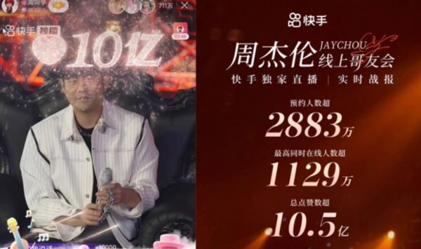 最近一次是在2022年底,快手再次打出周杰伦这张牌,上线了“哥友会”直播活动。快手公布的数据显示,截至当晚,周杰伦此次线上“哥友会”预约人数超2883万,最高同时在线人数超1129万,总点赞数超10亿。