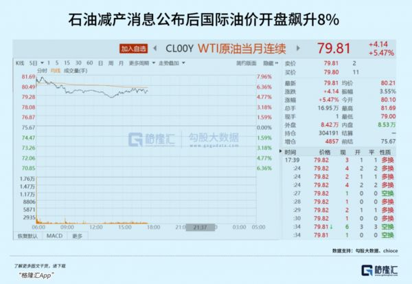 减产消息公布后,全球油价立即飙升。亚洲市场4月3日早盘开盘时油价飙升8%,而美油也一度飙升8%,为一年多最大盘中涨幅,交易价格突破每桶81美元。