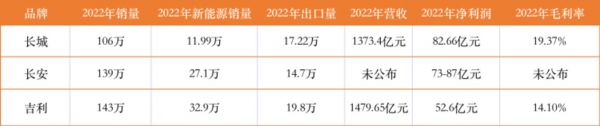 长城、长安、吉利2022年销量与营收对比 制表:品驾