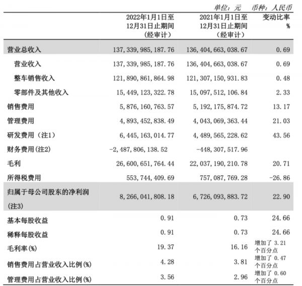 长城汽车2022年财报发布了,值得关注的是,2022年,长城汽车营业总收入1373.4亿元,同比增长为0.69%,但是归属于上市公司股东的净利润82.66亿元,同比增长22.90%。