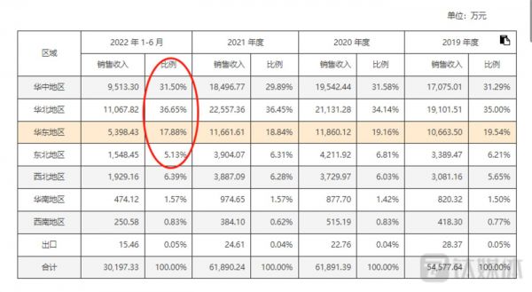 而从紫林醋业的销售区域看,其主要销售地在华北、华中地区,华东地区和东北地区的占比则在不断减弱。财报数据显示,2019年—2021年,华中地区营收分别为1.71亿元、1.95亿元、1.85亿元,在总营收中占比分别为31.29%、31.58%、29.89%。华北地区营收分别为1.91亿元、2.11亿元、2.26亿元,分别占比35%、34.14%、36.45%。华东地区的销售占比则从2019年的19.54%下降到2022年上半年的17.88%。