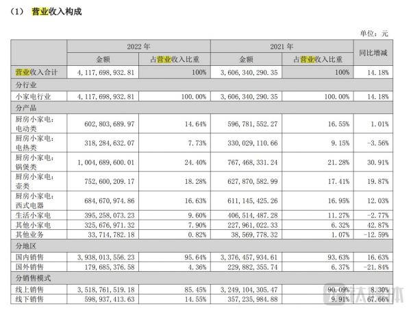 小熊电器于2019年上市,是一家以自主品牌“小熊”为核心,运用互联网大数据进行创意小家电研发、设计、生产和销售的企业。2022年公司实现营业收入41.18亿元,同比增长14.18%,营收突破40亿元,自上市以来最高。钛媒体APP发现,小熊电器的产品主要以厨房小家电(包括电动类、电热类、锅煲类等产品)为主,营收占比超过8成。对厨房小家电具体分析,其中锅煲类产品实现营收10.05亿元,是收入贡献最多的产品,占总营收比重为24%;电动类产品、电热类产品、壶类产品、西式电器产品分别实现营收6.03亿元、3.18亿元、7.53亿元、6.85亿元,均占比不到20%。对比来看,锅煲类产品营收同比增长31%,增速较快;其次是壶类和西式电器产品,分别增长19.87%、12.03%,而电热类是唯一一个营收下滑的产品,同比下降3.56%。