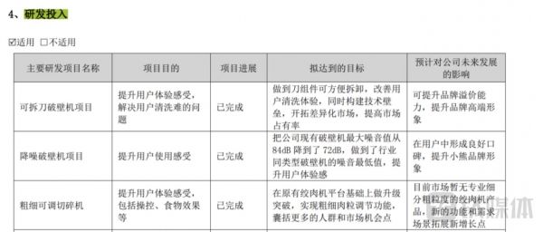 小熊电器的研发费用占营收比重均不超过4%。2022年,公司研发费用占比为3.33%,与2021年相比有所下降。具体来看小熊电器的研发项目(包括可拆刀破壁机项目、降噪破壁机项目) ,可以看出公司研发目的大多数是为了提升用户感受,从而提升品牌形象。