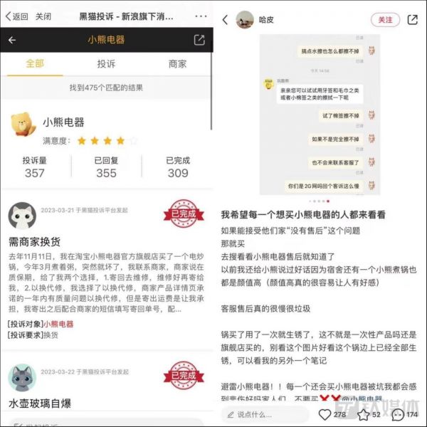 此外,在黑猫投诉平台上,以“小熊电器”关键词为检索,相关投诉累计有350多条,而近一个月的相关投诉便有10条,均因产品质量问题、虚假发货等问题被消费者投诉。在小红书平台,除了因质量问题之外,更多的是因为小熊电器售后服务态度差而被消费者吐槽。