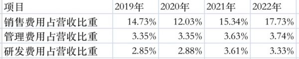 小家电企业“重营销、轻研发”的问题一直被业内外所诟病,小熊家电也不例外。2019年-2021年,公司的销售费用占营收比重分别为14.73%、12.03%、15.34%,整体呈上升趋势。2022年,小熊电器销售费用为7.3亿元,同比增加31.94%,销售费用占比上升至17.73%,再创新高。对比同行来看,2022年,苏泊尔、九阳股份的销售费用占比分别为10.69%、15.65%,均低于小熊电器。