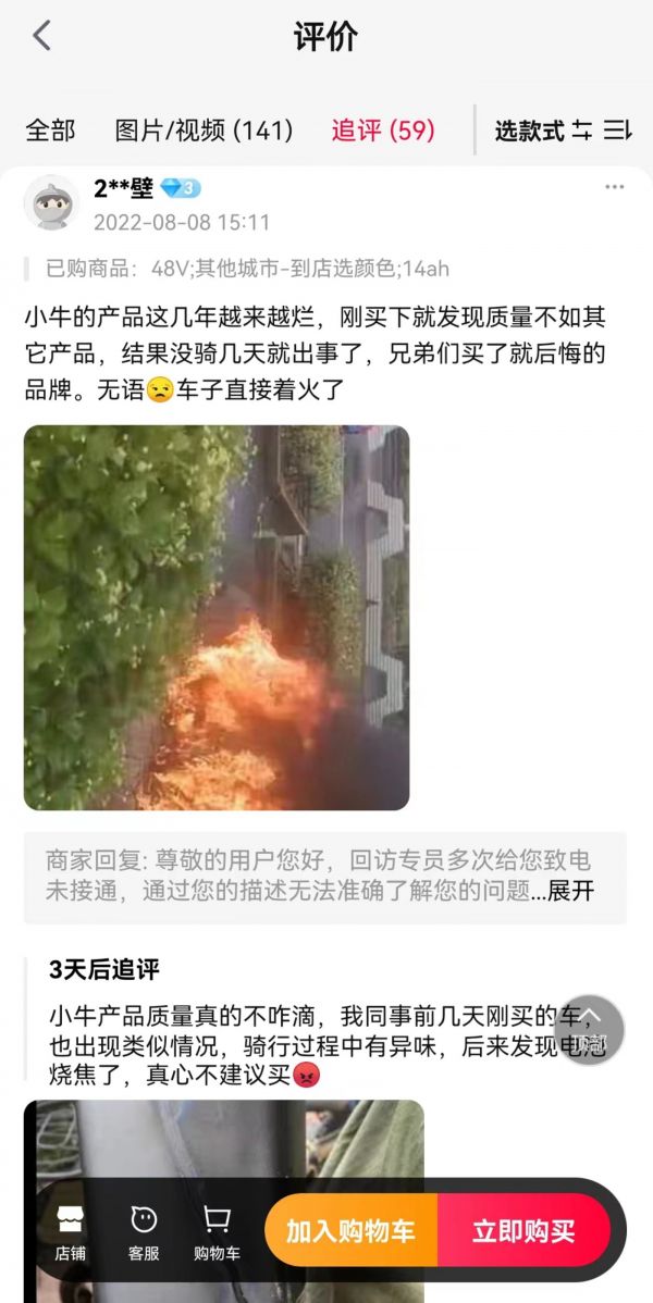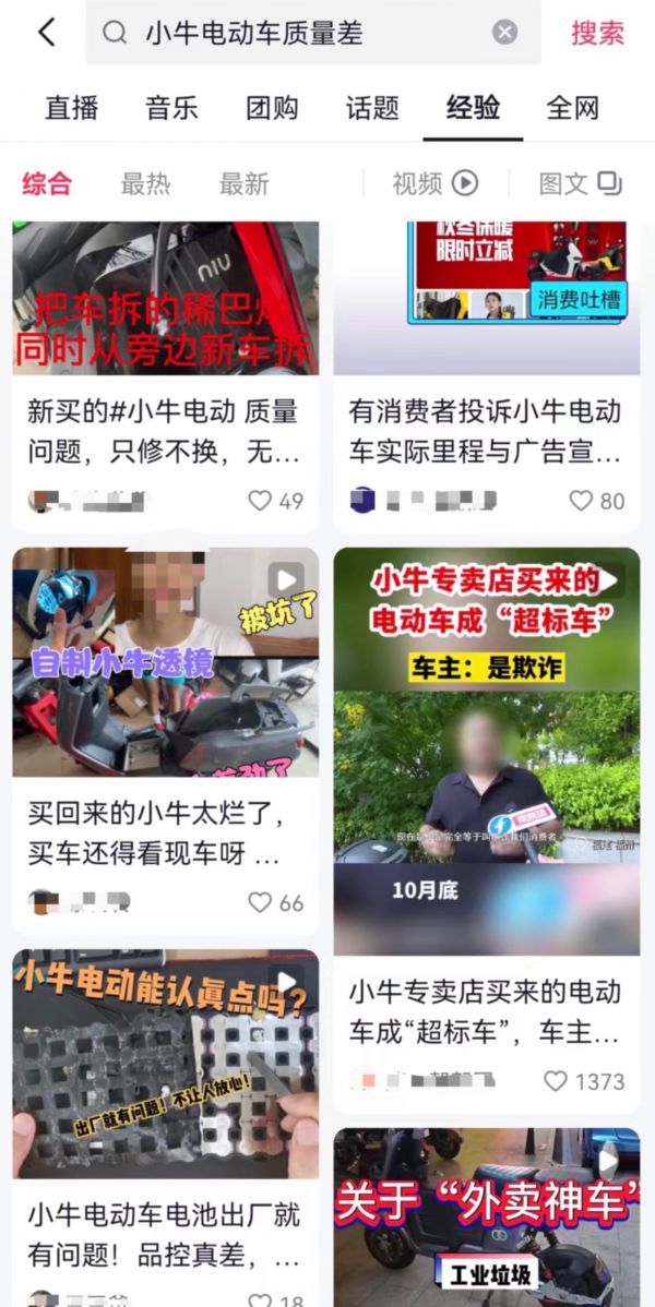 「探客出行」还注意到,小牛电动也陷入了口碑信誉下滑的尴尬境地。无论是在抖音、小红书等社交平台,还是在天猫、京东等电商平台,抑或是在黑猫投诉等投诉平台上,都能看到关于小牛电动产品质量问题的投诉。