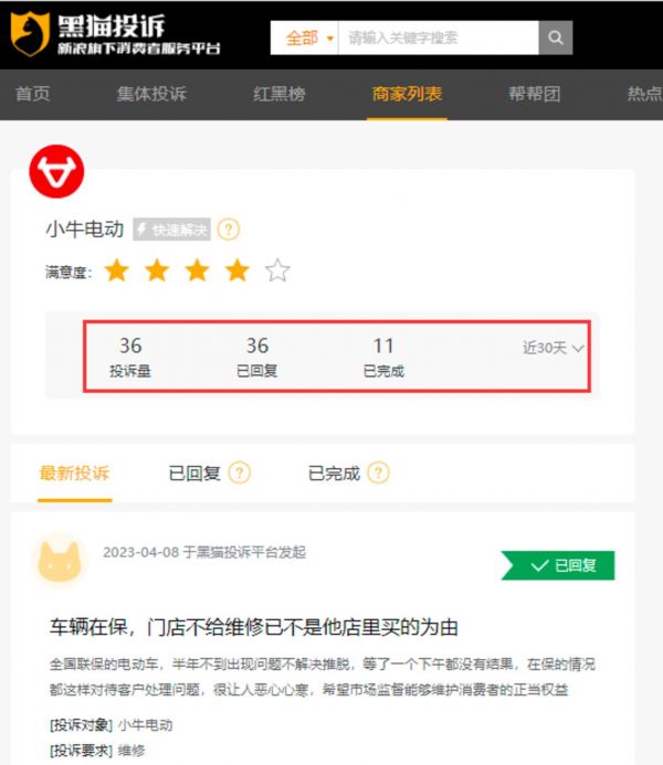而且,小牛电动对于消费者们的投诉似乎不够重视。「探客出行」在黑猫投诉平台上发现,近30天关于小牛电动的投诉达36起,平均每天至少被投诉一次,完成率仅为30.56%。