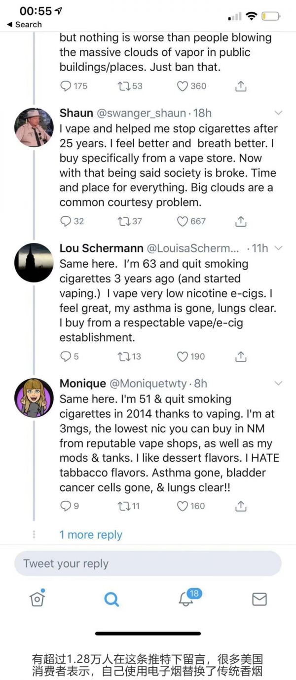 有超过1.28万人在这条推特下留言,还有6.15万人点赞。其中有人称:“电子烟成功帮我戒掉抽了25年的卷烟,我的肺部也因此变得干净了。”另一位63岁的老者表示:“我已经3年不抽卷烟了,这种低尼古丁的产品让人感觉更好。”投资者 Michael Coudrey则表示,“不希望过度监管伤害到电子烟企业主或经销商。因为与可能由电子烟造成的6人死亡相比,每年由传统烟草造成的死亡人数达60万。”