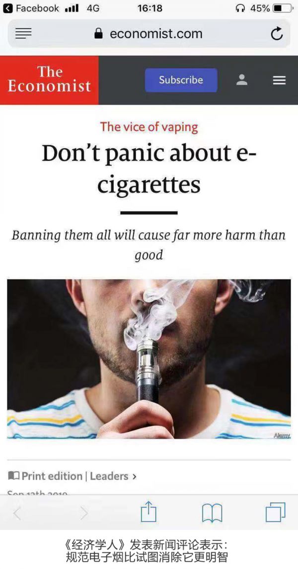 已经拥有170多年历史的权威媒体《经济学人》表示,公众对电子烟的分歧其实源自当下电子烟的发展乱象。一个核心事实是:美国最近对外报道中,引发争议的电子烟并非来自正规商店购买的产品,而是来自街头的劣质货。6起有关电子烟的投诉纠纷中,有5起用户使用的是非法购买的电子烟产品。剩下1起,其烟油是用户从俄勒冈州一家合法大麻商店自购的。