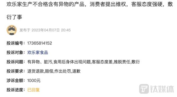 钛媒体APP发现,在黑猫投诉平台,以欢乐家为关键词进行检索,发现因产品问题等问题被消费者投诉,而最新一条投诉是在4天前,消费者称黄桃罐头含有异物要求公司赔偿道歉。对于欢乐家产品质量被消费者投诉的问题,欢乐家向钛媒体APP表示,有针对这方面进行整改。(本文首发于钛媒体APP,作者|李若菡)