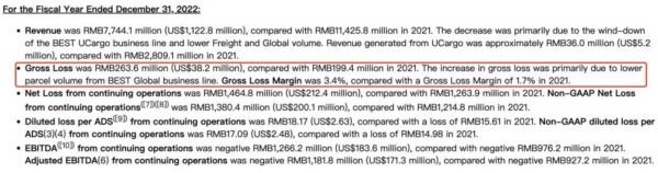 财报数据显示,百世集团2022年全年营收77.44亿元人民币,毛亏损2.64亿元,相比去年同期的1.99亿元,同比增加了近33%。持续经营的净亏损为14.65 亿元,上年同期净亏损为12.64亿元,同比增长了近16%。
