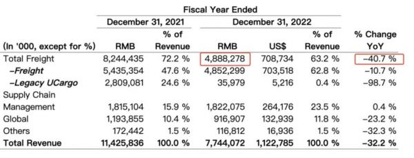 从收入结构看,快运业务是集团最主要营收来源。财报数据显示,百世快运去年营收达48.9亿元,同比下降40.7%,但净亏损收窄28.5%,如果不看合并过来的优货 业务,快运服务收入同比下降10.7%。