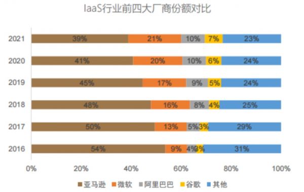 图3:IaaS行业前四大厂商份额对比,资料来源:彭博,IDC,Gartner,复星恒利