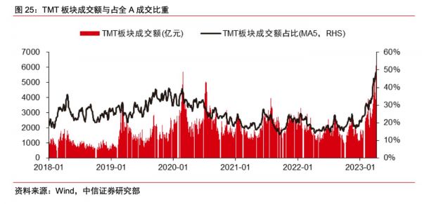 根据中信报告,截至4月6日,AI板块大本营——TMT行业,无论是融资净买入成交占比,还是板块成交占 A 股成交比例(47.3%), 都处于历史峰值水平,可谓情绪到达顶峰。