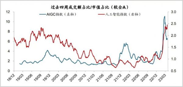 现在整个A股的情况是,AIGC和人工智能指数的相对成交热度在过去一个月极速飙升,纷纷创下历史新高。