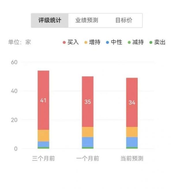 关于此,从机构评级也可见一斑:当前建议“买入”的机构数量为34家,还没有三个月前的41家多。
