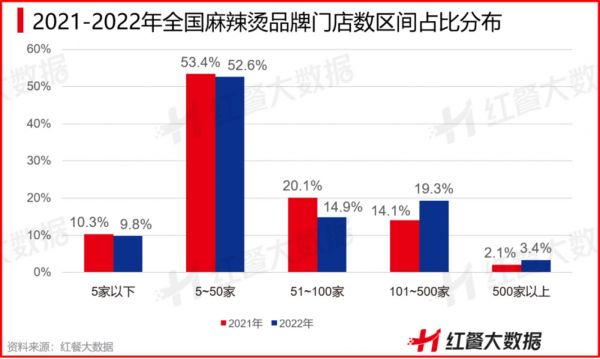 即便众多品牌门店数增长迅速,但总体来看,门店数超过500家的麻辣烫品牌依然寥寥无几。红餐大数据显示,2022年麻辣烫品类中,门店数在500家以上的品牌占比仅为3.4%。