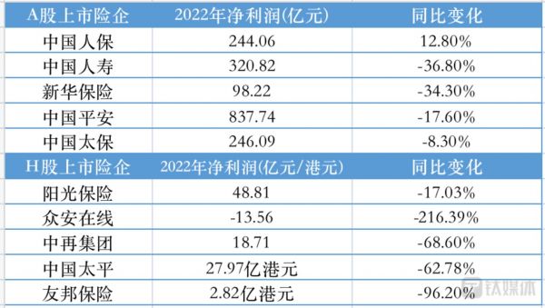 H股上市险企同样表现不佳。阳光保险、众安在线、中再集团、中国太平、友邦保险的2022年净利润分别为48.81亿元、-13.56亿元、18.71亿元、27.97亿港元、2.82亿港元,分别同比下降17.03%、216.39%、68.6%、62.78%以及96.20%。