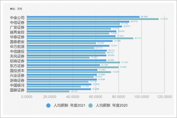 2022年,“三中一华”(中信、中金、中信建投、华泰)的薪酬都出现明显下降,中金公司人均薪酬下降19.67万元,华泰证券人均下降18.97万元,中信建投人均下降10.32万元,中信证券人均下降7.12万元。