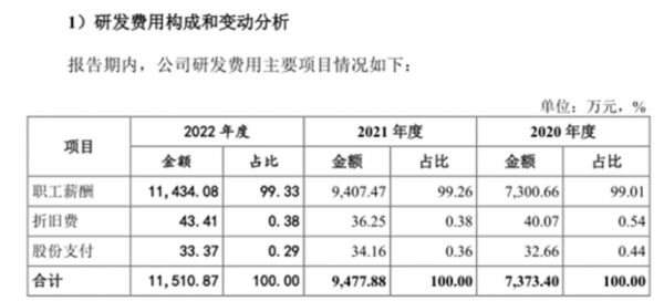 有意思的是,观察衡泰技术的研发费用明细,主要是由职工薪酬、折旧费、股份支付构成,其中职工薪酬的金额分别为7300.66万元、9407.47万元、11434.08万元,分别占当期研发费用总额的99.01%、99.26%、99.33%,这也意味着,衡泰技术的研发费用就是给员工发工资。这就不禁令人感到疑惑,衡泰技术的研发水平难道就是靠员工“闭门造车”,不需要依靠其他外部的原材料等“工具”?