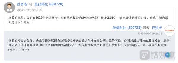 虽然两则公告均未透露这家上市公司的名称,但经过钛媒体APP梳理后发现,佳都科技跌宕起伏的业绩似乎与云从科技有着密切联系。早在今年3月,佳都科技发布2022年业绩预亏公告后,便有投资者追问致使佳都科技业绩亏损的企业是何方神圣,随后佳都科技在投资者互动平台中表示,造成公司亏损原因为战略投资云从科技在报告期内股价下跌。