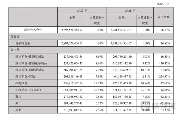 近日,盐津铺子(002847.SZ)发布2022年年报,报告期内公司实现营业收入28.94亿元,同比增加26.83%;归母净利润3.02亿元,同比增加100.01%;扣非净利润2.76亿元,同比增加201.47%。